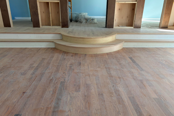 December was a month of ups and downs. Once the floors were installed and mostly stained, our contractor needed a special-ordered piece of curved wood to complete the ambon and stain the stage (future altar space).